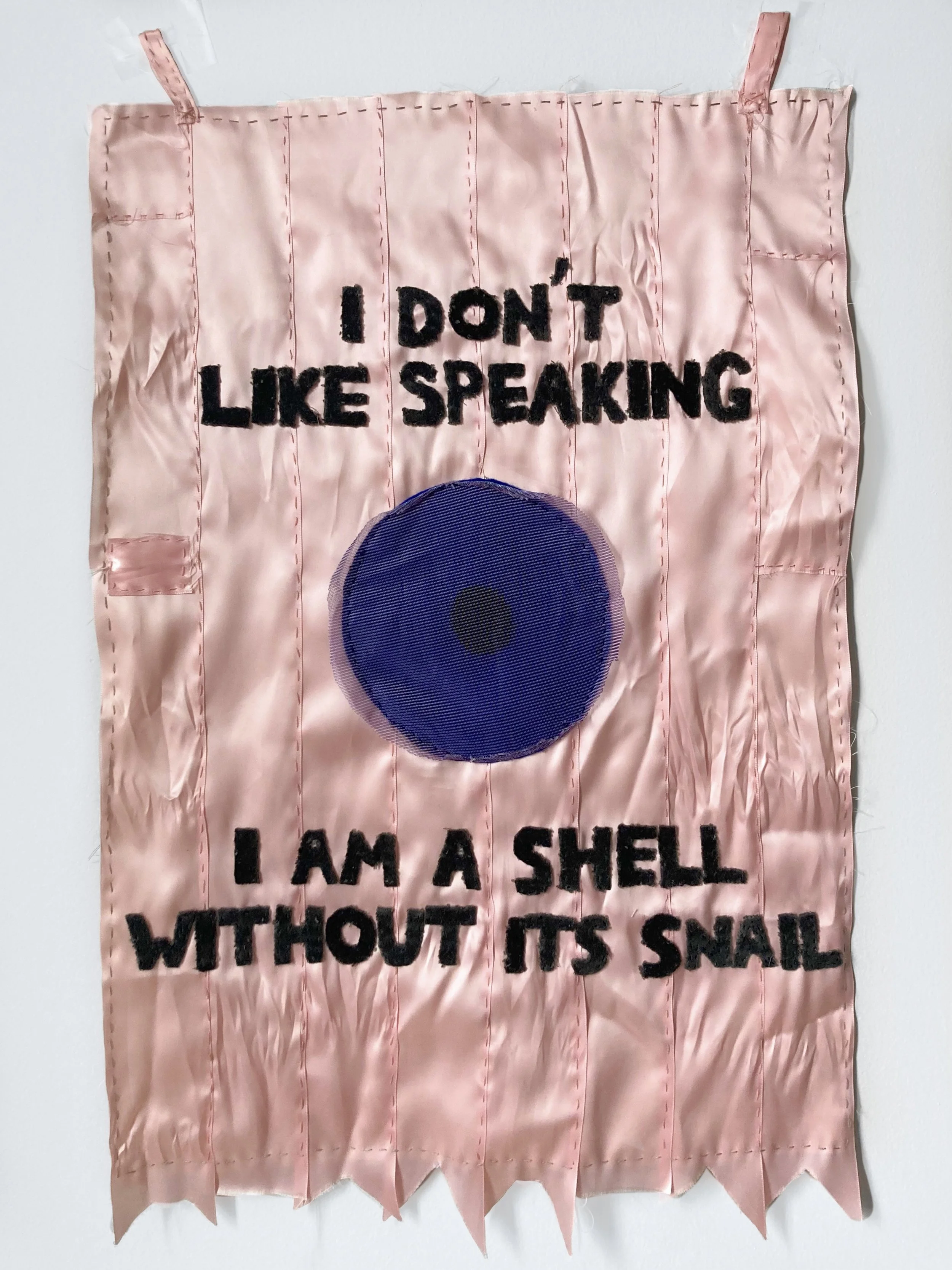 2023. "I don't like speaking." 16.5 x 27 inches. Recycled fabric, ribbon.