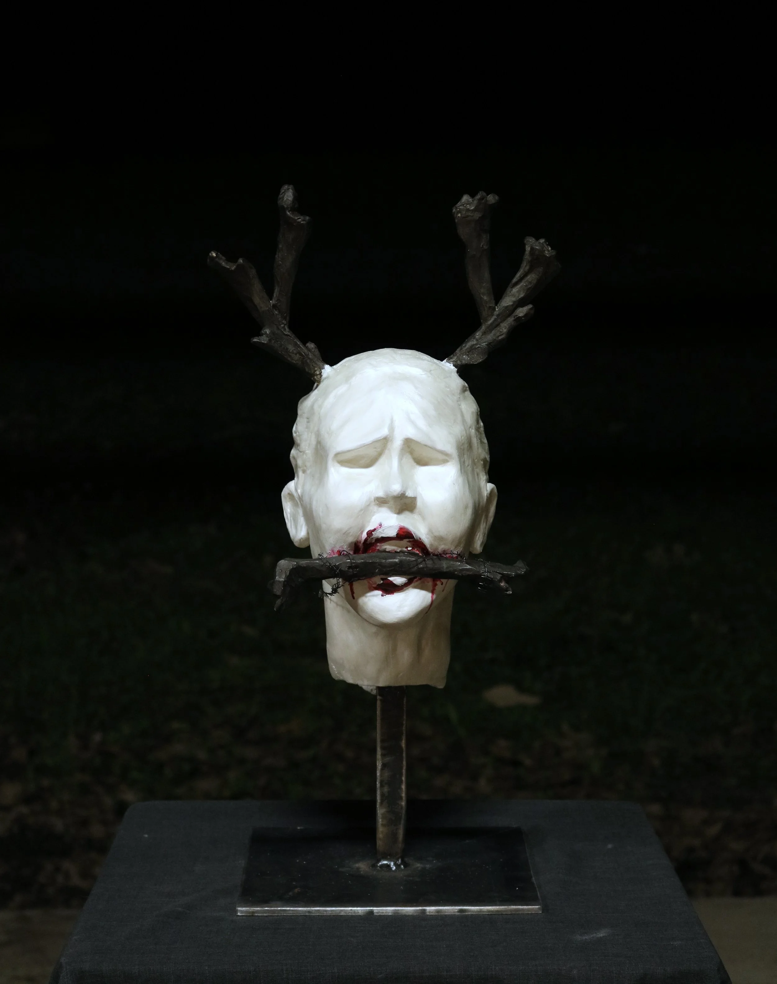 "Roadkill Trophy," 2024. Tissue paper, chicken wire, PVA, gesso, found wood, ribbon. Approx. 44 x 44 inches.